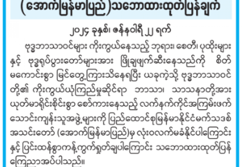 ဗုဒ္ဓဘာသာဝင်များ ကိုးကွယ်နေသည့် ဘုရား၊ စေတီ၊ ပုထိုးများနှင့် ဗုဒ္ဓရုပ်ပွားတော်များအား ဖြိုချဖျက်ဆီးနေသည်ကို စိတ်မကောင်းစွာ မြင်တွေ့ကြားသိနေရပြီး ယခုကဲ့သို့ ဗုဒ္ဓဘာသာဝင် တို့၏ ကိုးကွယ်ယုံကြည်မှုဆိုင်ရာ ဘာသာ၊ သာသနာတို့အား ယုတ်မာရိုင်းစိုင်းစွာ စော်ကားနေသည့် လက်နက်ကိုင်အကြမ်းဖက် သောင်းကျန်းသူအဖွဲ့များကို ပြည်ထောင်စုမြန်မာနိုင်ငံမက်သဒစ်အသင်းတော် (အောက်မြန်မာပြည်) မှ လုံးဝလက်မခံနိုင်ပါကြောင်းနှင့် ပြင်းထန်စွာကန့်ကွက်ရှုတ်ချပါကြောင်း သဘောထားထုတ်ပြန် ကြေညာအပ်ပါသည်။