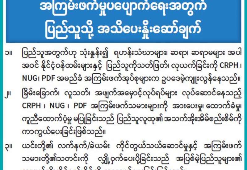 ၁။ ပြည်သူအတွက်ဟု သုံးနှုန်း၍ ရဟန်းသံဃာများ၊ ဆရာ၊ ဆရာမများအပါအဝင် နိုင်ငံ့ဝန်ထမ်းများနှင့် ပြည်သူကိုသတ်ဖြတ်၊ လုယက်ခြင်းကို CRPH ၊ NUG ၊ PDF အမည်ခံ အကြမ်းဖက်အုပ်စုများက ဥပဒေမဲ့ကျူးလွန်နေသည်။