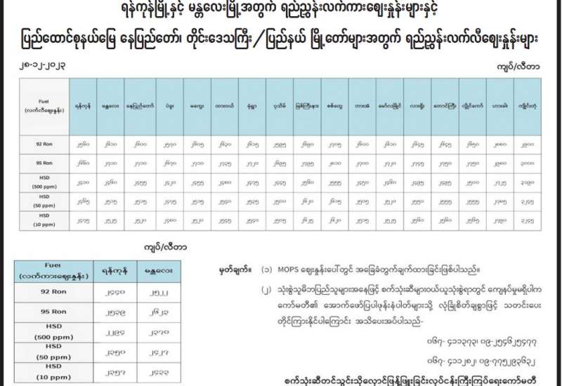 ရန်ကုန်မြို့နှင့် မန္တလေးမြို့အတွက် ရည်ညွှန်းလက်ကားဈေးနှုန်းများနှင့် ပြည်ထောင်စုနယ်မြေ နေပြည်တော်၊ တိုင်းဒေသကြီး/ပြည်နယ် မြို့တော်များအတွက် ရည်ညွှန်းလက်လီဈေးနှုန်းများ