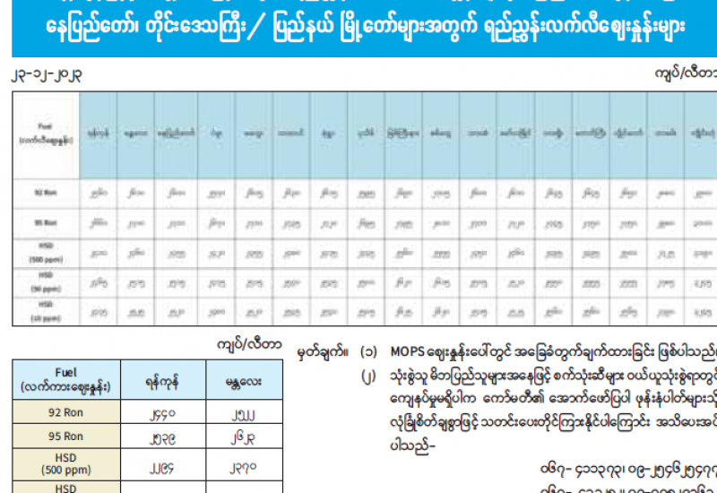 ရန်ကုန်မြို့နှင့် မန္တလေးမြို့အတွက် ရည်ညွှန်းလက်ကားဈေးနှုန်းများနှင့် ပြည်ထောင်စုနယ်မြေ နေပြည်တော်၊ တိုင်းဒေသကြီး/ ပြည်နယ် မြို့တော်များအတွက် ရည်ညွှန်းလက်လီဈေးနှုန်းများ
