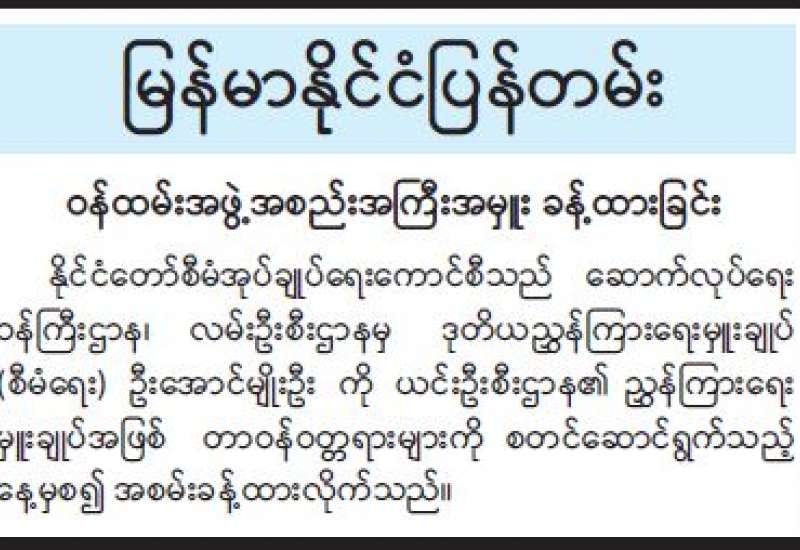 အမျိုးသားမြေဥပဒေရေးဆွဲပြုစုရေးနှင့် မြေစီမံခန့်ခွဲမှုဆိုင်ရာဥပဒေများ သဟဇာတဖြစ်ရေးလုပ်ငန်းကော်မတီ၏ တတိယအကြိမ်အစည်းအဝေးကို ယနေ့မွန်းလွဲပိုင်းတွင် စိုက်ပျိုးရေး၊ မွေးမြူရေးနှင့် ဆည်မြောင်းဝန်ကြီးဌာန ပြည်ထောင်စုဝန်ကြီးရုံး အစည်းအဝေးခန်းမ၌ ကျင်းပရာ လုပ်ငန်းကော်မတီ ဥက္ကဋ္ဌ(၁) ပြည်ထောင်စုဝန်ကြီး ဦးမင်းနောင်၊ ဥက္ကဋ္ဌ (၂) ပြည်ထောင်စုဝန်ကြီး ဦးခင်မောင်ရီ နှင့် အဖွဲ့ဝင်များ၊ အထောက်အကူပြုလုပ်ငန်းအဖွဲ့ဥက္ကဋ္ဌနှင့် ဥပဒေရေးဆွဲရေးအဖွဲ့ငယ်များမှ အဖွဲ့ခေါင်းဆောင်များ တက်ရောက်ကြသည်။