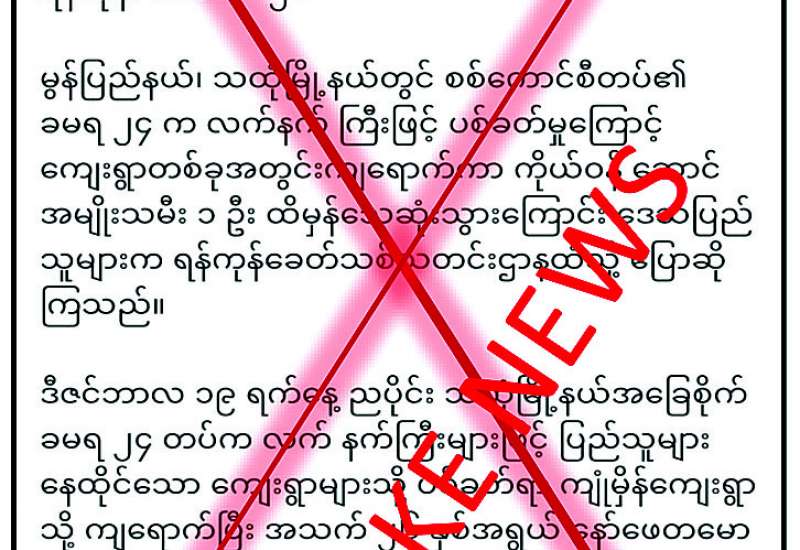 မွန်ပြည်နယ် သထုံမြို့နယ်ရှိ နယ်မြေခံတပ်မှ ဒီဇင်ဘာ ၁၉ ရက်ညပိုင်းက လက်နက်ကြီးများဖြင့် ပြည်သူများနေထိုင်သော ကျေးရွာများသို့ ပစ်ခတ်ခဲ့မှုကြောင့် ကျုံမှိန်ကျေးရွာသို့ကျရောက်ပြီး အသက် ၂၆ နှစ်အရွယ် ကိုယ်ဝန်ဆောင်အမျိုးသမီးတစ်ဦး ထိမှန်သေဆုံးခဲ့ကြောင်း သတင်းတု၊ သတင်းအမှားများကို တရားမဝင်ပြည်ဖျက်မီဒီယာ Khit Thit က မဟုတ်မမှန် ရေးသားဖြန့်ဝေလျက်ရှိသည်ကို တွေ့ရှိရသည်။