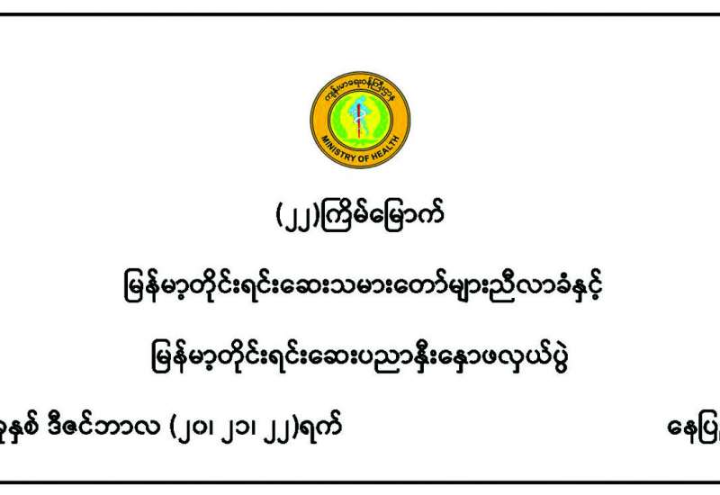 ကျန်းမာရေးဝန်ကြီးဌာန၊ ကျန်းမာရေးလူ့စွမ်းအားအရင်းအမြစ်ဦးစီးဌာနမှကြီးမှူး၍ ကမ္ဘာ့ကျန်းမာရေးအဖွဲ့ အထောက်အပံ့ဖြင့် ကျန်းမာရေးလူ့စွမ်းအားအရင်းအမြစ် အခြေအနေများကို ပြန်လည်သုံးသပ်ပြီး အနာဂတ်အစီအမံများရေးဆွဲခြင်းဆွေးနွေးပွဲ ဖွင့်ပွဲအခမ်းအနားကို ယနေ့တွင် နေပြည်တော်ရှိ ကျန်းမာရေးဝန်ကြီးဌာန၌ ကျင်းပသည်။