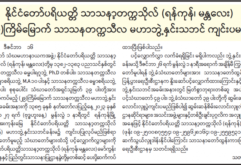 နိုင်ငံတော်ပရိယတ္တိ သာသနာ့တက္ကသိုလ် (ရန်ကုန်၊ မန္တလေး) (၂၉) ကြိမ်မြောက် သာသနတက္ကသီလ မဟာဘွဲ့နှင်းသဘင် ကျင်းပမည်