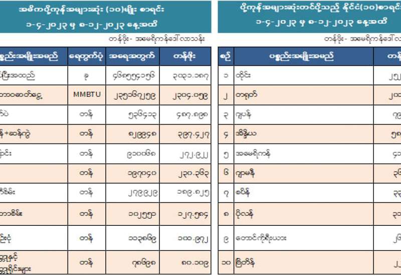 ၂၀၂၃ ခုနှစ်၊ ဒီဇင်ဘာလ၏ ပထမရက်သတ္တပတ်အတွင်း မြန်မာနိုင်ငံ၏ ပြည်ပပို့ကုန်တင်ပို့မှုတန်ဖိုးမှာ အမေရိကန် ဒေါ်လာ ၂၂၁ သန်းရှိပါသည်။ သီးနှံရာသီပြက္ခဒိန်၏ ရလဒ်များပေါ်ထွန်းရာသီဖြစ်သည်နှင့်အညီ လယ်ယာထွက်ကုန်များစွာ လှိုင်လှိုင်တင်ပို့လာနိုင်တော့မည့်ကာလ ဖြစ်ပါသည်။ ယခုရက်သတ္တပတ်အတွင်း ဆန်၊ ဆန်ကွဲ၊ မတ်ပဲ၊ ပဲတီစိမ်း၊ ပဲလွန်းဖြူ၊ မြေထောက်ပဲ၊ မြေပဲဆံ၊ နှမ်း၊ ပြောင်း၊ ရော်ဘာ၊ သစ်သီးဝလံ၊ ဝဥ၊ ဂျင်းခြောက်၊ သီဟိုဠ်၊ ငရုတ်၊ ကွမ်းသီး၊ မန်ကျည်းသီးများ တင်ပို့နိုင်ခဲ့ပါသည်။