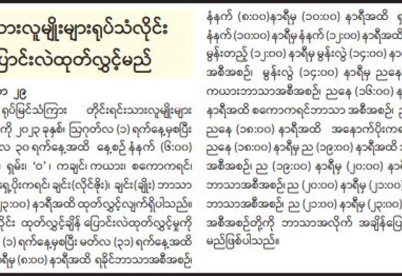 မြန်မာနိုင်ငံကို ချစ်ကြည်ရေးအလည်အပတ်ခရီးစဉ်နဲ့ မြန်မာ - တရုတ်ရေကြောင်းလုံခြုံရေး လေ့ကျင့်ခန်းဆောင်ရွက်ဖို့ ရောက်ရှိနေတဲ့ တရုတ်ပြည်သူ့သမ္မတနိုင်ငံ တရုတ်ပြည်သူ့လွတ်မြောက်ရေးတပ်မတော် (ရေ) မှ စစ်ရေယာဉ်သုံးစင်းမှ စစ်သည်များက ဒီနေ့မှာတော့ ရန်ကုန်မြို့အတွင်းမှာ ချစ်ကြည်ရေးခရီးလည်ပတ်ခြင်း၊ သန်လျင်တပ်နယ်မှာတော့ ချစ်ကြည်ရေးဘတ်စကက်ဘောပြိုင်ပွဲကျင်းပပြုလုပ်ခြင်းနဲ့ မြန်မာ့တပ်မတော် (ရေ) မှ အရာရှိများက စစ်ရေးယာဉ်များကို သွားရောက်လေ့လာခြင်း၊ ညစာစားပွဲ တည်ခင်းဧည့်ခံခြင်းလုပ်ငန်းများကို လုပ်ဆောင်ခဲ့ပါတယ်။ နယ်စပ်ဒေသတရားဥပဒေစိုးမိုးရေး၊ လုံခြုံရေးကိစ္စရပ်များကို ပူးပေါင်းဆောင်ရွက်လျက်ရှိရာမှာ မြန်မာနိုင်ငံဘက်ကို တရားမဝင် ဝင်ရောက်နေထိုင်တဲ့ အမျိုးသား ၂၁၁ ဦး၊ အမျိုးသမီး ၅၁ ဦး စုစုပေါင်း ၂၆၂ ဦးကို တရုတ်ပြည်သူ့သမ္မတနိုင်ငံမှ တာဝန်ရှိ သူများထံကို လွှဲပြောင်းပေးနိုင်ခဲ့ပါတယ်။ အားလုံးလွှဲပြောင်းပေးခဲ့မှု ၁၀၁၇၀ ရှိပြီးဖြစ်ပါတယ်။ နှစ်နိုင်ငံအစိုးရနဲ့ နှစ်နိုင်ငံတပ်မတော်များအနေနဲ့ နီးကပ်စွာ၊ ရင်းနှီးစွာနေထိုင်လျက်ရှိပါတယ်။ ဒီဟာတွေနဲ့ ပတ်သက်ပြီး အနောက်နိုင်ငံတွေက ထောက်ပံ့ထားတဲ့ ပြည်ဖျက်မီဒီယာများအနေနဲ့ အမျိုးမျိုးဝေဖန်နေတာတွေရှိပါတယ်။ ဘယ်လိုပဲဖြစ်ဖြစ် ကျွန်တော်တို့သည် ငြိမ်းချမ်းစွာ အတူယှဉ်တွဲနေထိုင်ရေးမူကြီး (၅) ရပ်နဲ့အညီ နှစ်ပေါင်းများစွာ ချစ်ကြည်ရင်းနှီးစွာ နေထိုင်လာခဲ့တာ ဖြစ်ပါတယ်။ တရုတ် - မြန်မာနှစ်နိုင်ငံဆက်ဆံရေး၊ တပ်မတော်ချင်း ဆက်ဆံရေး၊ ပြည်သူလူထုချင်း ဆက်ဆံရေးဟာ နောင်မှာလည်း ပိုမိုရင်းနှီးချစ်ကြည်နီးကပ်လာမှာဖြစ်ကြောင်း ပြောကြားလိုပါတယ်။