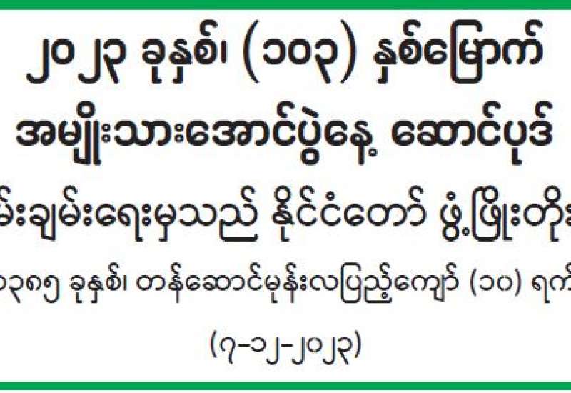 မြန်မာနိုင်ငံအိုလံပစ်ကော်မတီနှင့် မြန်မာနိုင်ငံ အားကစားမီဒီယာများအဖွဲ့ချုပ်တို့ ပူးပေါင်း၍ ၂၀၂၂ ခုနှစ်အတွက် အကောင်းဆုံးအားကစားသမားဆုများ ချီးမြှင့်ပွဲအခမ်းအနားကို ယနေ့နံနက် ၁၀ နာရီတွင် နေပြည်တော်အားကစားလေ့ကျင့်ရေးစခန်း (Gold Camp) ရှိ Multipurpose Hall ၌ ကျင်းပသည်။