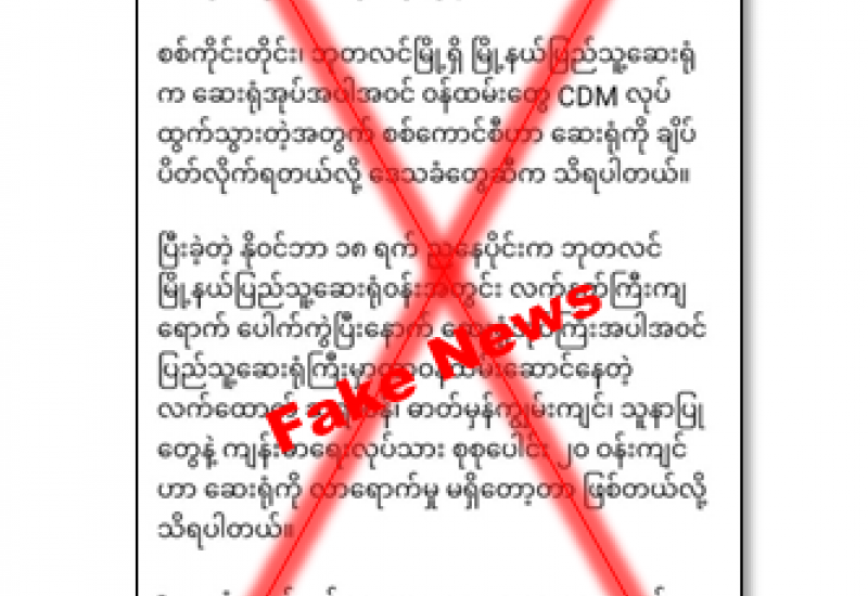 စစ်ကိုင်းတိုင်းဒသကြီး၊ ဘုတလင်မြို့ပြည်သူ့ဆေးရုံ၌ တာဝန်ထမ်းဆောင်လျက်ရှိသည့် ကျန်းမာရေးဝန်ထမ်းများအားလုံး CDM ပြုလုပ်သွားသဖြင့် တပ်မတော်မှအဆိုပါဆေးရုံအား ချိတ်ပိတ်လိုက်ကြောင်း Social Media များ၌ သတင်းမှားများ ဖြန့်ဝေလျက်ရှိသည်။