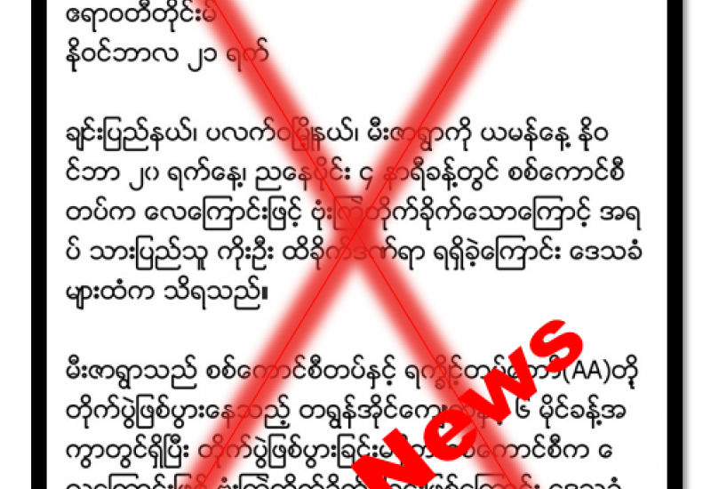 ချင်းပြည်နယ်၊ ပလက်ဝမြို့နယ်၊ မီးဇာရွာအနီးသို့ နိုဝင်ဘာ ၂၀ ရက် ညနေပိုင်းတွင် တပ်မတော်မှ လေကြောင်းအသုံးပြု၍ ဗုံးကြဲတိုက်ခိုက်ခဲ့ခြင်းကြောင့် ဒေသခံပြည်သူ ၉ ဦး ထိခိုက်ဒဏ်ရာရရှိခဲ့ကြောင်း လူမှုကွန်ရက်စာမျက်နှာများ၌ မဟုတ်မမှန်သတင်းမှားများ ထုတ်လွှင့်ဖော်ပြလျက်ရှိသည်ကို တွေ့ရှိရသည်။