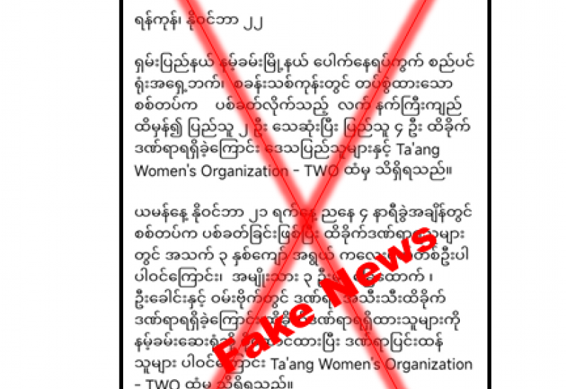 ရှမ်းပြည်နယ် (မြောက်ပိုင်း)၊ နမ့်ခမ်းမြို့အတွင်းသို့ နိုဝင်ဘာ ၂၁ ရက်ညနေပိုင်းတွင် တပ်မတော်မှလက်နက်ကြီးများဖြင့် ပစ်ခတ်တိုက်ခိုက်ခဲ့ကြောင်းနှင့် ဒေသခံပြည်သူများ သေဆုံးထိခိုက်ဒဏ်ရာရခဲ့ကြောင်းကို လူမှုကွန်ရက်စာမျက်နှာများ၌ မဟုတ်မမှန်သတင်းမှားများ ထုတ်လွှင့်ဖော်ပြလျက်ရှိသည်ကို တွေ့ရှိရသည်။