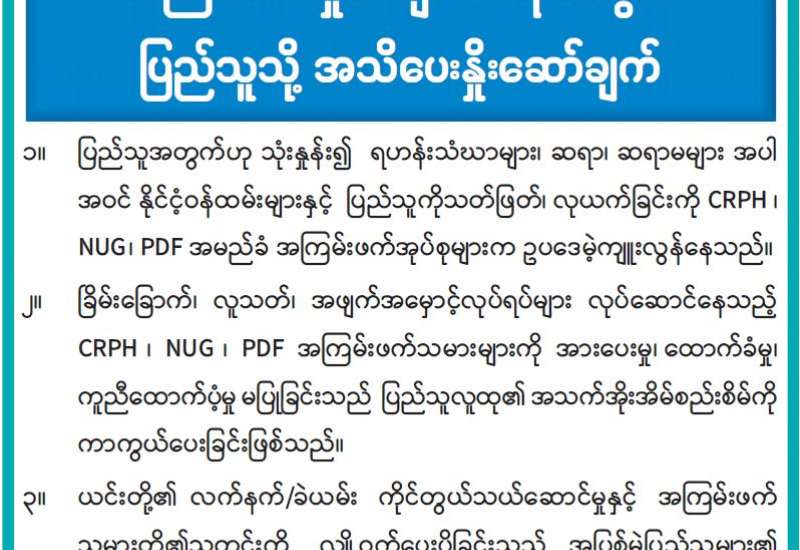 အကြမ်းဖက်အုပ်စုအဖြစ် ကြေညာထားသော CRPH၊ NUG နှင့် ယင်းတို့၏ လက်ဝေခံအဖွဲ့အစည်းများ၊ ယင်းတို့နှင့် ဆက်နွှယ်နေသောအဖွဲ့အစည်းများ၊ လူပုဂ္ဂိုလ်များသည် နိုင်ငံတော်တည်ငြိမ်အေးချမ်းရေးကို ပျက်ပြားစေရန်နှင့် ပြည်သူလူထုကို အကြောက်တရားများ ဖြစ်ပေါ်စေပြီး အစိုးရယန္တရားများ ပျက်ပြားစေရန် ရည်ရွယ်လျက် လှုံ့ဆော်ခြင်း၊ ဝါဒဖြန့်ခြင်း၊ ခြိမ်းခြောက်ခြင်းများကို လူမှုကွန်ရက်များမှတစ်ဆင့် နည်းမျိုးစုံဖြင့် ပြုလုပ်လျက်ရှိပါသည်။