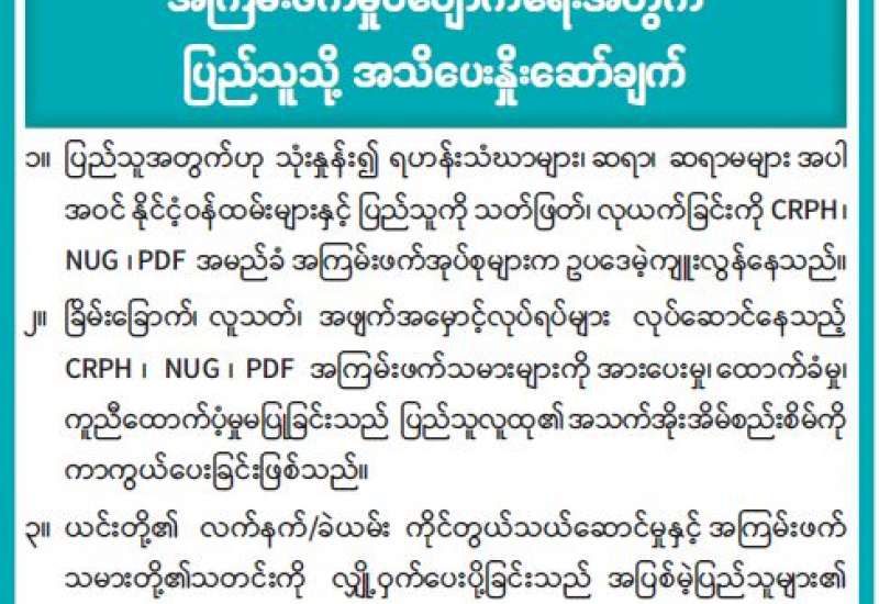 အကြမ်းဖက်အုပ်စုအဖြစ် ကြေညာထားသော CRPH၊ NUG နှင့် ယင်းတို့၏လက်ဝေခံ အဖွဲ့အစည်းများ၊ ယင်းတို့နှင့်ဆက်နွှယ်နေသော အဖွဲ့အစည်းများ၊ လူပုဂ္ဂိုလ်များသည် နိုင်ငံတော်တည်ငြိမ်အေးချမ်းရေးကိုပျက်ပြားစေရန်နှင့် ပြည်သူလူထုကိုအကြောက်တရားများ ဖြစ်ပေါ်စေပြီး အစိုးရယန္တရားများပျက်ပြားစေရန်ရည်ရွယ်လျက် လှုံ့ဆော်ခြင်း၊ ဝါဒဖြန့်ခြင်း၊ ခြိမ်းခြောက်ခြင်းများကို လူမှုကွန်ရက်များမှတစ်ဆင့် နည်းမျိုးစုံဖြင့် ပြုလုပ်လျက်ရှိပါသည်။