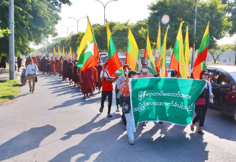 အမျိုးသားရေးဦးဆောင်ဆရာတော် တောင်သာလေး ဆရာတော် ဦးအဂ္ဂဓဇနှင့် သံဃာတော်များ၊ တပ်မတော်ချစ်မြတ်နိုးသူများအဖွဲ့(မန္တလေး)မှ ဦးချစ်ကိုကိုတို့ ဦးဆောင်သော ပြည်သူစုစုပေါင်း ၂၀၀၀ ခန့်သည် တပ်မတော်၏ ငြိမ်းချမ်းရေးကြိုးပမ်းမှုအားထောက်ခံသည့် ရည်ရွယ်ချက်ဖြင့် တပ်မတော်ထောက်ခံချီတက်ပွဲကို ယနေ့နံနက် ၈ နာရီခွဲက မန္တလေးတောင်ခြေရှိ ၁၂ လမ်း၊ ၆၆ လမ်းထောင့်တွင် ပြုလုပ်ကြသည်။