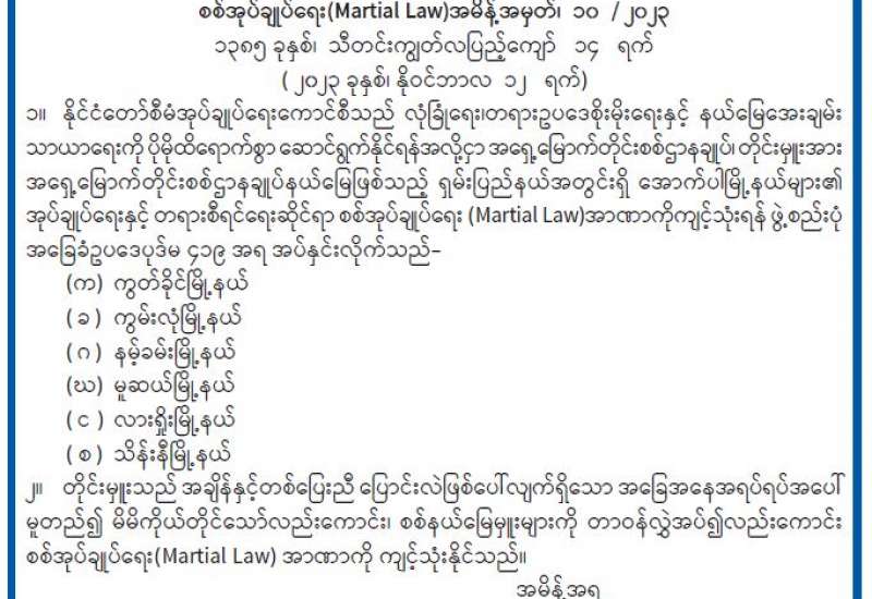 ၁။ နိုင်ငံတော်စီမံအုပ်ချုပ်ရေးကောင်စီသည် လုံခြုံရေး၊တရားဥပဒေစိုးမိုးရေးနှင့် နယ်မြေအေးချမ်းသာယာရေးကို ပိုမိုထိရောက်စွာ ဆောင်ရွက်နိုင်ရန်အလို့ငှာ အရှေ့မြောက်တိုင်း စစ်ဌာနချုပ်၊ တိုင်းမှူးအား အရှေ့မြောက်တိုင်းစစ်ဌာနချုပ်နယ်မြေဖြစ်သည့် ရှမ်းပြည်နယ်အတွင်းရှိ အောက်ပါမြို့နယ်များ၏ အုပ်ချုပ်ရေးနှင့် တရားစီရင်ရေးဆိုင်ရာ စစ်အုပ်ချုပ်ရေး (Martial Law) အာဏာကို ကျင့်သုံးရန် ဖွဲ့စည်းပုံအခြေခံဥပဒေပုဒ်မ ၄၁၉ အရ အပ်နှင်းလိုက်သည်-