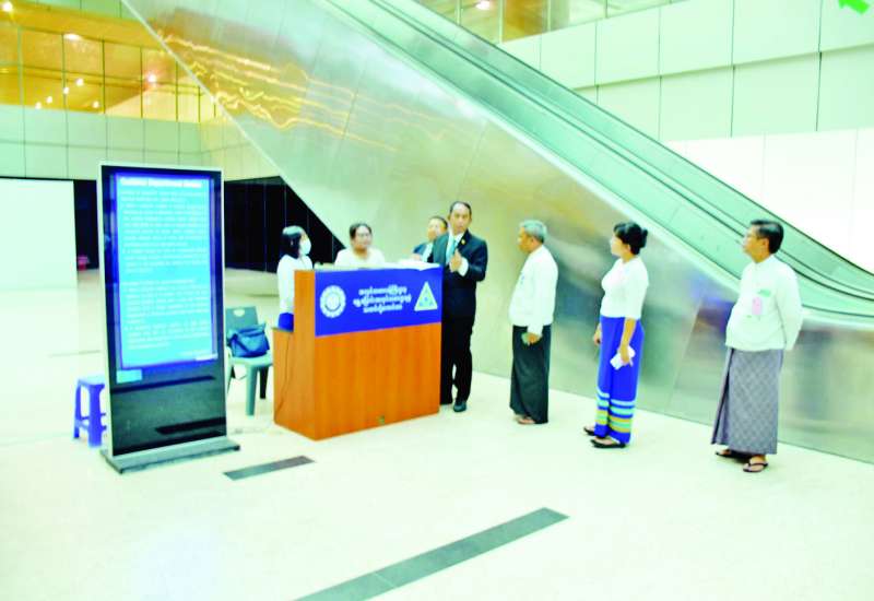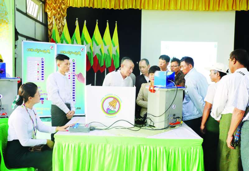 ပြည်ထောင်စု ရွေးကောက်ပွဲ ကော်မရှင်က မဲဆန္ဒရှင်ပြည်သူများနှင့် တွေ့ဆုံ၍မြန်မာအီလက် ထရောနစ်မဲပေးစက် (MEVM) နှင့် စပ်လျဉ်းပြီး ရှင်းလင်းပြသခြင်းနှင့် လက်တွေ့သရုပ်ပြ စမ်းသပ်မဲပေးခြင်းများကို ယနေ့တွင် တပ်ကုန်းမြို့နယ်၌ ပဉ္စမနေ့အဖြစ်မြို့နယ် အထွေထွေအုပ်ချုပ်ရေးဦးစီးဌာနအစည်းအဝေးခန်းမ၌ ဆောင်ရွက်ခဲ့သည်။