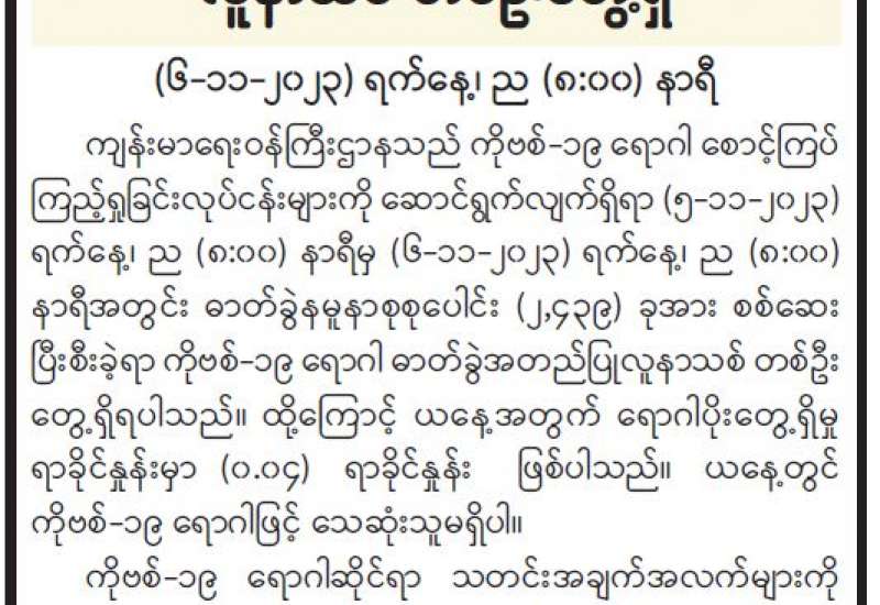 ကျန်းမာရေးဝန်ကြီးဌာနသည် ကိုဗစ်-၁၉ ရောဂါ စောင့်ကြပ်ကြည့်ရှုခြင်းလုပ်ငန်းများကို ဆောင်ရွက်လျက်ရှိရာ (၆-၁၁-၂၀၂၃) ရက်နေ့၊ ည (၈:၀၀) နာရီမှ (၇-၁၁-၂၀၂၃) ရက်နေ့၊ ည (၈:၀၀) နာရီအတွင်း ဓာတ်ခွဲနမူနာစုစုပေါင်း (၃,၁၁၅) ခုအား စစ်ဆေးပြီးစီးခဲ့ရာ COVID-19 ရောဂါ ဓာတ်ခွဲအတည်ပြု လူနာသစ် မတွေ့ရှိရပါ။ ယနေ့တွင် COVID-19 ရောဂါဖြင့် သေဆုံးသူ မရှိပါ။