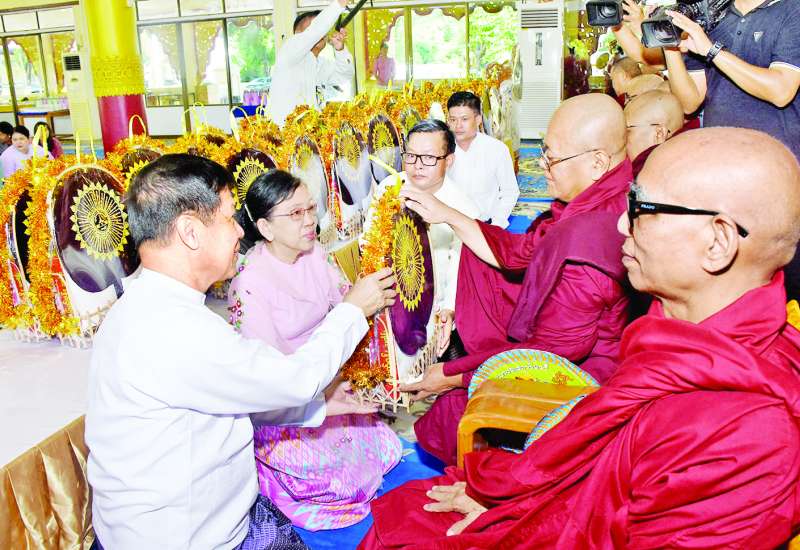 မန္တလေးမြို့တော် စည်ပင်သာယာရေးကော်မတီ မိသားစုတို့၏ (၇၉)ကြိမ်မြောက် စုပေါင်းမဟာဘုံကထိန်ပွဲတော် ရေစက်ချအလှူတော်မင်္ဂလာအခမ်းအနားကို ယနေ့နံနက်ပိုင်းက အောင်မြေသာစံမြို့နယ် နိုင်ငံတော်ပရိယတ္တိ သာသနာ့တက္ကသိုလ် (မန္တလေး)၏ မဟာဘွဲ့နှင်းသဘင် ခန်းမတွင် ကျင်းပရာ နိုင်ငံတော်ပရိယတ္တိ သာသနာ့တက္ကသိုလ် (မန္တလေး)ပါမောက္ခချုပ် ဆရာတော် ဒေါက်တာဘဒ္ဒန္တကေသရ အမှူးပြုပြီး ဆရာတော်သံဃာတော် အပါး ၃၃၀ ကြွရောက်ချီးမြှင့်၍ မန္တလေးတိုင်းဒေသကြီး အစိုးရအဖွဲ့ ဝန်ကြီးချုပ်ဦးမျိုးအောင်နှင့်ဇနီး၊ တိုင်းဒေသကြီး တရားလွှတ်တော် တရားသူကြီးချုပ်၊ တိုင်းဒေသကြီး အစိုးရအဖွဲ့ဝင် ဝန်ကြီးများနှင့် ၎င်းတို့၏ဇနီးများ၊ ဖိတ်ကြားထားသည့် ဧည့်သည်တော်များ၊ အလှူ ရှင်များ၊ မန္တလေးမြို့တော် စည်ပင်သာယာရေးကော်မတီ အတွင်းရေးမှူးနှင့် တွဲဖက်အတွင်းရေးမှူး၊ ကော်မတီဝင်များ၊ ဌာနမှူးများ၊ မြို့တော်စည်ပင်ဌာန အသီးသီးမှအရာထမ်း၊ အမှုထမ်းဝန်ထမ်းများနှင့် မိသားစုများ တက်ရောက်ကြည်ညိုကြသည်။