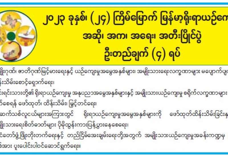 ကျန်းမာရေးဝန်ကြီးဌာနသည် ကိုဗစ်-၁၉ ရောဂါ စောင့်ကြပ်ကြည့်ရှုခြင်းလုပ်ငန်းများကို ဆောင်ရွက်လျက်ရှိရာ (၂၃-၁၀-၂၀၂၃) ရက်နေ့၊ ည (၈:၀၀) နာရီမှ (၂၄-၁၀-၂၀၂၃) ရက်နေ့၊ ည (၈:၀၀) နာရီအတွင်း ဓာတ်ခွဲနမူနာစုစုပေါင်း (၂,၇၂၈) ခုအား စစ်ဆေးပြီးစီးခဲ့ရာ COVID-19 ရောဂါ ဓာတ်ခွဲအတည်ပြုလူနာသစ် မတွေ့ရှိရပါ။ ယနေ့တွင် COVID-19 ရောဂါဖြင့် သေဆုံးသူမရှိပါ။