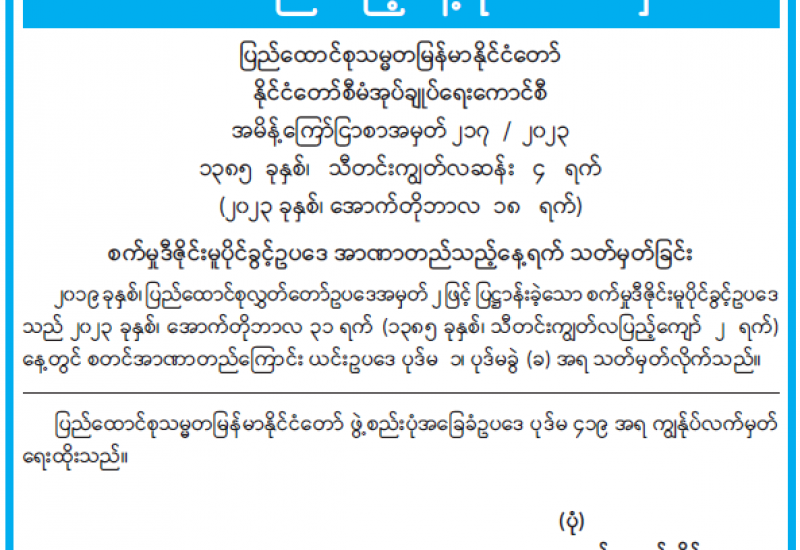 စက်မှုဒီဇိုင်းမူပိုင်ခွင့်ဥပဒေ အာဏာတည်သည့်နေ့ရက် သတ်မှတ်