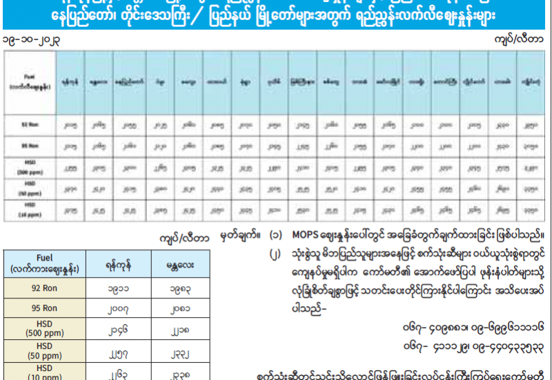 ရန်ကုန်မြို့နှင့် မန္တလေးမြို့အတွက် ရည်ညွှန်းလက်ကားဈေးနှုန်းများနှင့် ပြည်ထောင်စုနယ်မြေ နေပြည်တော်၊ တိုင်းဒေသကြီး/ ပြည်နယ် မြို့တော်များအတွက် ရည်ညွှန်းလက်လီဈေးနှုန်းများ