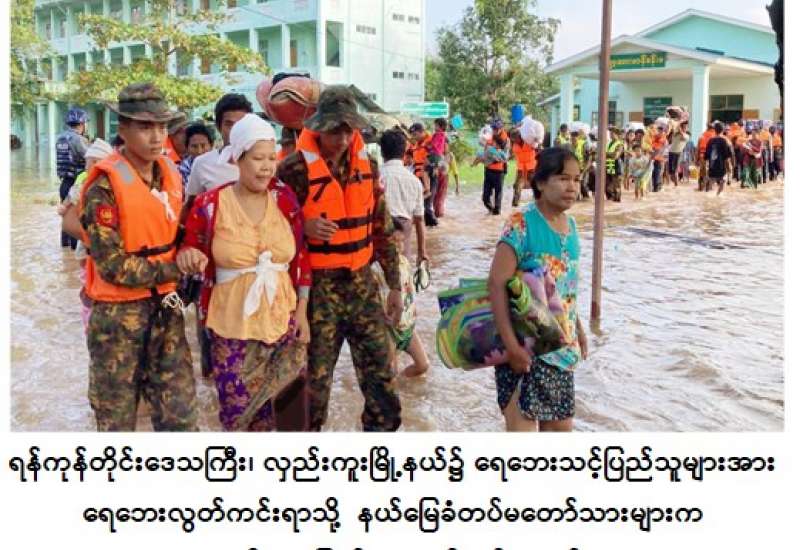 ရန်ကုန်တိုင်းဒေသကြီး၊ လှည်းကူးမြို့နယ်အတွင်း ဖွင့်လှစ်ထားရှိသော ပညာရေးဒီဂရီကောလိပ် ရေဘေးကယ်ဆယ်ရေးစခန်း၌ ယနေ့နံနက်ပိုင်းတွင် ထပ်မံရေဝင်ရောက်မှုများ ဖြစ်ပေါ်ခဲ့သဖြင့် ရန်ကုန်တိုင်းစစ်ဌာနချုပ် ကွပ်ကဲမှုအောက် နယ်မြေခံတပ်မတော်သားများက ရေဘေးသင့်ပြည်သူ အိမ်ထောင်စု ၂၇၀ စု၊ လူဦးရေ ၆၅၀ ဦးနှင့် လှူဒါန်းထားရှိသည့် စားနပ်ရိက္ခာများအား အဆိုပါမြို့နယ်ရှိ ရေဘေးလွတ်ရာ Uniwin အထည်ချုပ်စက်ရုံသို့ ကူညီကယ်ဆယ် ရွှေ့ပြောင်းခြင်း လုပ်ငန်းများ ဆောင်ရွက်ပေးသည်။