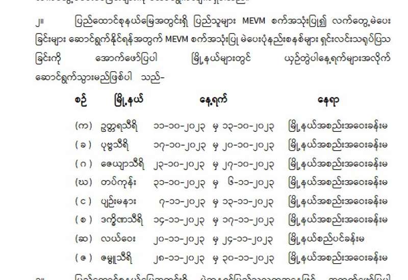 ရန်ကုန်တိုင်းဒေသကြီး၊ လှည်းကူးမြို့နယ်၊ ကျောက်ကုတင်ကျေးရွာအုပ်စု၊ ကဒစ်ကျေးရွာ၊ မှော်ဘီမြို့နယ်၊ မြောင်းတကာကျေးရွာနှင့် တိုက်ကြီးမြို့နယ်၊ ဖလုံကျေးရွာအုပ်စု၊ စပါးကိုင်းကျေးရွာတို့၌ အောက်တိုဘာလ ၉ ရက်တွင် မိုးသည်းထန်စွာရွာသွန်းမှုကြောင့် ရေဝင်ရောက်မှုများဖြစ်ပေါ်ခဲ့သဖြင့် ရန်ကုန်တိုင်းစစ်ဌာနချုပ်ကွပ်ကဲမှုအောက် နယ်မြေခံတပ်မတော်သားများက ရေဘေးသင့်ပြည်သူများအား ရေဘေးကင်းလွတ်သည့်နေရာများနှင့် ယာယီကယ်ဆယ်ရေးစခန်းများသို့ ကူညီကယ်ဆယ်ရွှေ့ပြောင်းခြင်း၊ မော်တော်ယာဉ်များသွားလာနိုင်ရေး ကူညီဆောင်ရွက်ပေးခြင်း၊ ကျန်းမာရေးစောင့်ရှောက်ခြင်းလုပ်ငန်းများ ဆောင်ရွက်ပေးလျက်ရှိသည်။