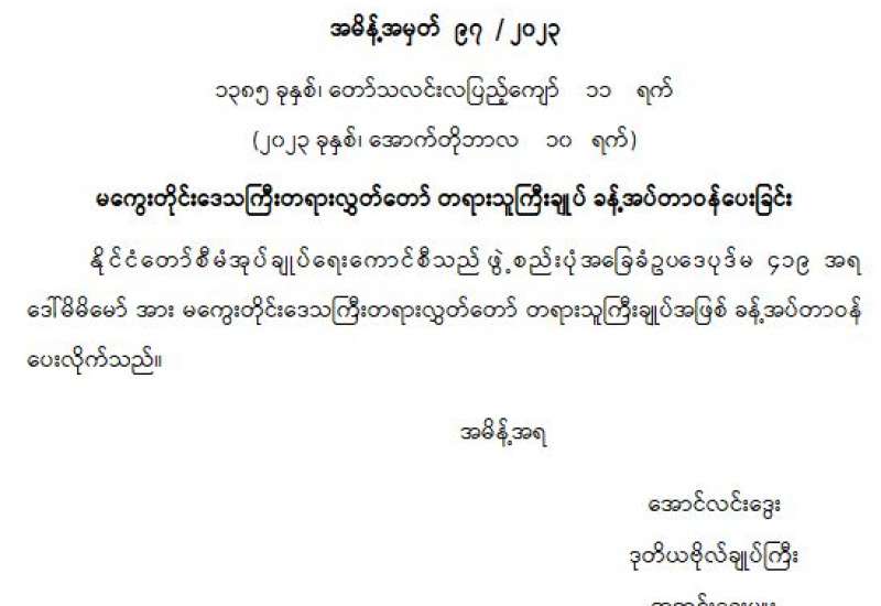 အခြေခံရည်ညွှန်းစပါးဈေးနှုန်း ထုတ်ပြန်ကြေညာချက်
