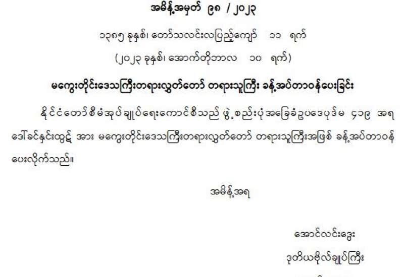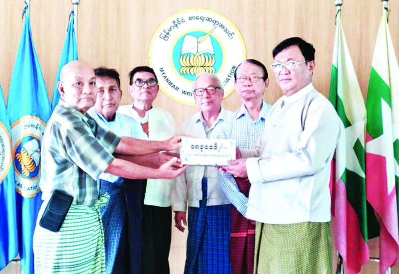မြန်မာနိုင်ငံစာရေးဆရာအသင်းက ၁၃၈၅ ခုနှစ်၊ မြန်မာနိုင်ငံစာဆိုတော်နေ့ အထိမ်းအမှတ်အဖြစ် (၃၆) ကြိမ်မြောက် သက်ကြီးစာပေပညာရှင်များ ပူဇော်ကန်တော့ပွဲအတွက် စေတနာရှင်များက အလှူငွေများ စတင်ပေးအပ်လှူဒါန်းကြရာ ဒေါပုံမြို့နယ် စာရေးဆရာအသင်းက ငွေကျပ် ၁၈၃၀၀၀၊ မှော်ဘီမြို့နယ် စာရေးဆရာအသင်းက ငွေကျပ် ၁၅၀၀၀၀ တို့ကို ပေးအပ်လှူဒါန်းရာ အသင်းဥက္ကဋ္ဌ ဦးအုန်းမောင် (မြင်းမူမောင်နိုင်မိုး)၊ အတွင်းရေးမှူး ဦးညွန့်တင် (မောင်ငြိမ်းသူ - ကြို့ပင်ကောက်)နှင့် တွဲဖက်အတွင်းရေးမှူးများက လက်ခံရယူပြီး ကျေးဇူးတင်စကား ပြောကြားသည်။