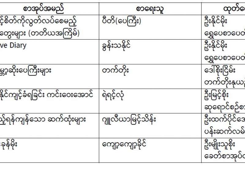 ၂၀၁၄ ခုနှစ်၊ ပုံနှိပ်ခြင်းနှင့်ထုတ်ဝေခြင်းလုပ်ငန်းဥပဒေ၊ နည်းဥပဒေများအရ ထုတ်ဝေသူများသည် မိမိတို့ထုတ်ဝေသည့် စာအုပ်စာစောင် ၅ အုပ် သို့မဟုတ် ၅ စောင်ကို ပြန်ကြားရေးဝန်ကြီးဌာနသို့ အဖိုးအခလွတ်ပေးအပ်ရမည်ဖြစ်ပါသည်။ ပြန်ကြားရေးဝန်ကြီးဌာနသည် အဆိုပါ စာအုပ်စာစောင်များကို မူပိုင်ခွင့်နှင့်စာအုပ်စာရင်း ၂ အုပ်၊ အမျိုးသားစာပေဆုစိစစ်ရွေးချယ်ရေးကော်မတီသို့ ၂ အုပ်နှင့် အမျိုးသား မှတ်တမ်းများမော်ကွန်းတိုက်ဦးစီးဌာနသို့ ၁ အုပ် ပေးပို့လျက်ရှိပါသည်။