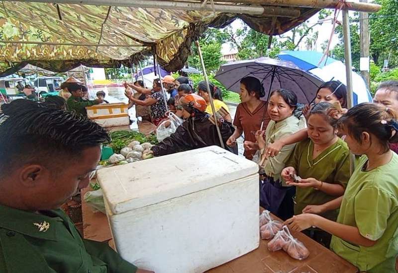ဆိုင်ကလုန်းမုန်တိုင်း(မိုခါ)တိုက်ခတ်မှုကြောင့် မုန်တိုင်းဒဏ်သင့် ဒေသခံပြည်သူများနှင့် ဌာနဆိုင်ရာဝန်ထမ်းများ၏ စားသောက်ရေးအဆင်ပြေစေရန်နှင့် စားသောက်ကုန်ပစ္စည်းများကို ဈေးနှုန်းသက်သာစွာဖြင့် ဝယ်ယူစားသောက်နိုင်ရေးအတွက် အနောက်ပိုင်းတိုင်းစစ်ဌာနချုပ်၊ နယ်မြေခံတပ်မတော်သားများနှင့် တာဝန်ရှိသူ များက နေ့စဉ်ရောင်းချပေးလျက်ရှိသည်။