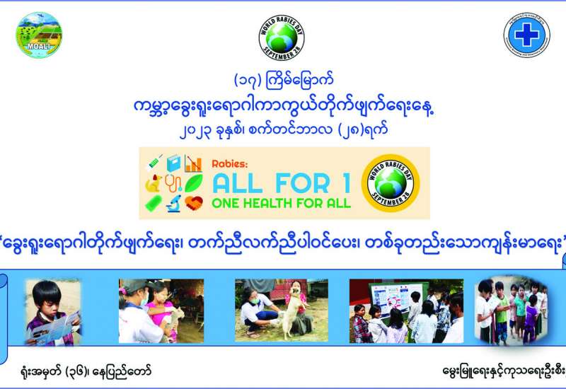 ကမ္ဘာ့ခွေးရူးရောဂါ ကာကွယ်တိုက်ဖျက်ရေးနေ့ကို နှစ်စဉ်စက်တင်ဘာ(၂၈)ရက်၌ ကျင်းပလျက်ရှိရာ (၁၇)ကြိမ်မြောက် ၂၀၂၃ ခုနှစ်၊ ကမ္ဘာ့ခွေးရူးရောဂါကာကွယ်တိုက်ဖျက်ရေးနေ့ အထိမ်းအမှတ်အခမ်းအနားကို ယနေ့တွင် Rabies: ALL FOR 1, ONE HEALTH FOR ALL, “ခွေးရူးရောဂါတိုက်ဖျက်ရေး၊ တက်ညီလက်ညီပါဝင်ပေး၊ တစ်ခုတည်းသောကျန်းမာရေး” ဆောင်ပုဒ်ဖြင့် နေပြည်တော် ရုံးအမှတ်(၃၆)တွင် ကျင်းပသည်။