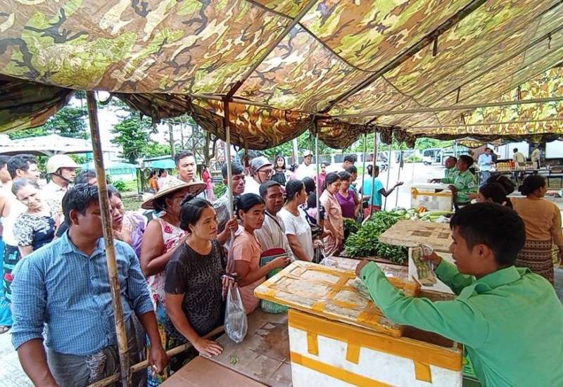 ဆိုင်ကလုန်းမုန်တိုင်း(မိုခါ) တိုက်ခတ်မှုကြောင့် မုန်တိုင်းဒဏ်သင့် ဒေသခံပြည်သူများနှင့် ဌာနဆိုင်ရာဝန်ထမ်းများ၏ စားသောက်ရေးအဆင်ပြေစေရန်နှင့် စားသောက်ကုန်ပစ္စည်းများကို ဈေးနှုန်းသက်သာစွာဖြင့် ဝယ်ယူစားသောက်နိုင်ရေးအတွက် အနောက်ပိုင်းတိုင်းစစ်ဌာနချုပ်၊ နယ်မြေခံတပ်မတော်သားများနှင့် တာဝန်ရှိသူများက နေ့စဉ်ရောင်းချပေးလျက်ရှိသည်။