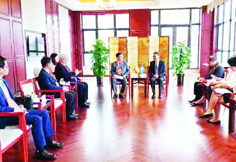 ၂၀၂၃ ခုနှစ် တရုတ် - အာဆီယံပညာရေး ပူးပေါင်းဆောင်ရွက်ရေး ရက်သတ္တပတ်အခမ်းအနားသို့ တက်ရောက်ရန် တရုတ်ပြည်သူ့သမ္မတနိုင်ငံ ကွေ့ကျိုးပြည်နယ် ကွေ့ရမ်မြို့၌ ရောက်ရှိနေသော ပြည်ထောင်စုဝန်ကြီးဒေါက်တာညွန့်ဖေ ဦးဆောင်သည့် မြန်မာကိုယ်စားလှယ်အဖွဲ့သည် ယနေ့မွန်းလွဲပိုင်းတွင် HowardJohnson Hotel တတိယထပ်ရှိ ဧည့်ခန်းမ၌ တရုတ် - အာဆီယံစင်တာ၏ အထွေထွေအတွင်းရေးမှူးချုပ် H.E. Mr. Shi Zhongjun ပါဝင်သည့်အဖွဲ့နှင့် တွေ့ဆုံသည်။