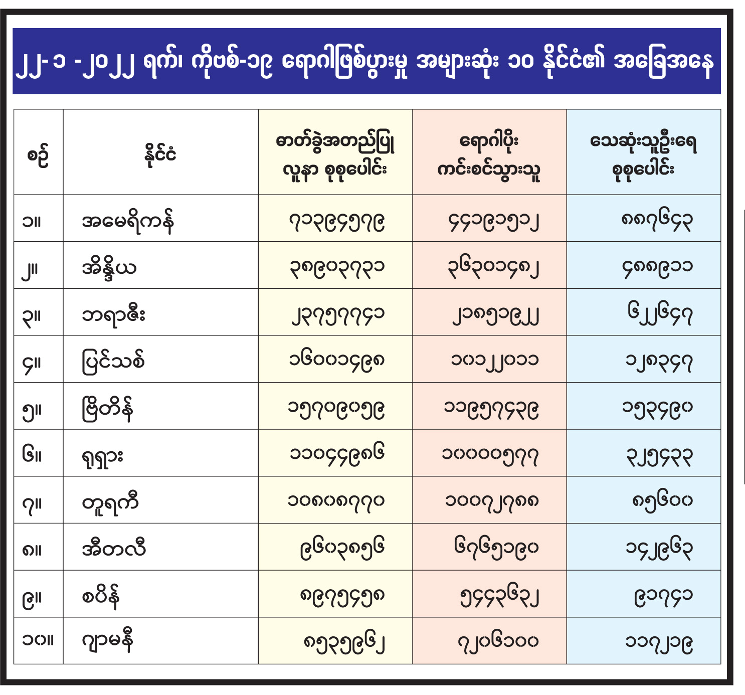 ၂၂- ၁ -၂၀၂၂ ရက်၊ ကိုဗစ်-၁၉ ရောဂါဖြစ်ပွားမှု အများဆုံး ၁၀ နိုင်ငံ၏ အခြေအနေ