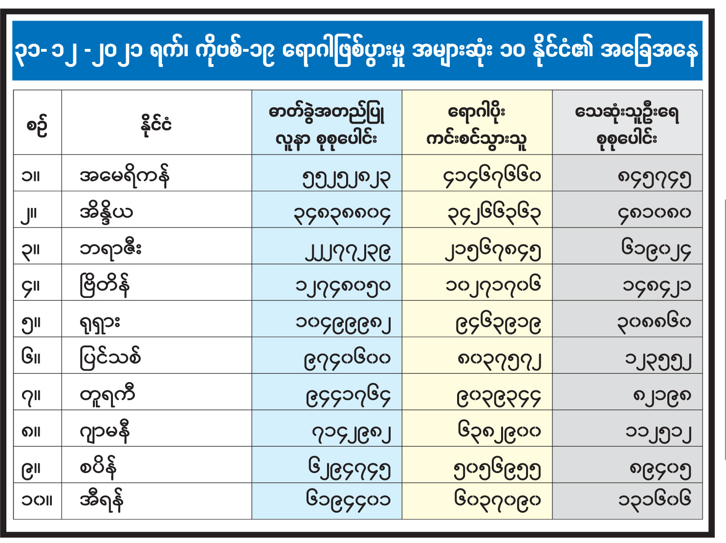၃၁- ၁၂ -၂၀၂၁ ရက်၊ ကိုဗစ်-၁၉ ရောဂါဖြစ်ပွားမှု အများဆုံး ၁၀ နိုင်ငံ၏ အခြေအနေ