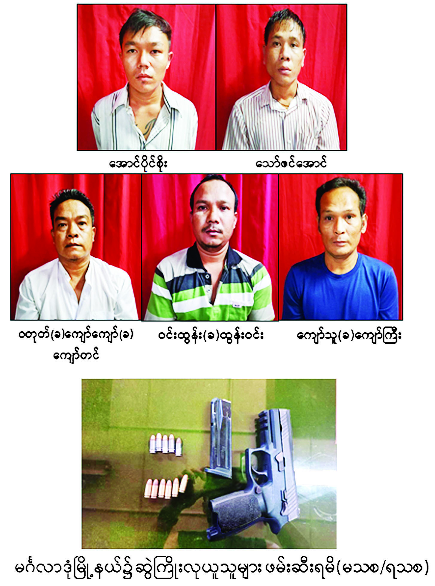 ၎င်းတို့သည် ဆွဲကြိုးလုယက် မှုကို ကျူးလွန်ပြီး အဆိုပါဆွဲကြိုး ကို လှိုင်သာယာ (အရှေ့ပိုင်း)မြို့နယ် ၁၀၃ မှတ်တိုင်အနီး၌ ငွေကျပ်ကိုးသိန်းဖြင့် ရောင်းချခဲ့ ကြောင်း သိရှိရပြီး လက်နက်ခဲယမ်း များနှင့်အတူ ဖမ်းဆီးရမိသူများ အား တရားဥပဒေနှင့်အညီ အမှုဖွင့် အရေးယူနိုင်ရေး ဆောင် ရွက်လျက်ရှိကြောင်း သတင်းရရှိ သည်။