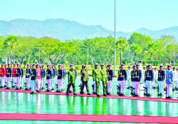 တပ်မတော်ကာကွယ်ရေးဦးစီးချုပ် ဗိုလ်ချုပ်မှူးကြီးမင်းအောင်လှိုင် ကမ္ဘောဒီးယားဘုရင့်တပ်မတော် ကာကွယ်ရေးဦးစီးချုပ် General Vong Pisen အား ဂုဏ်ပြုတပ်ဖွဲ့ဖြင့် ကြိုဆို