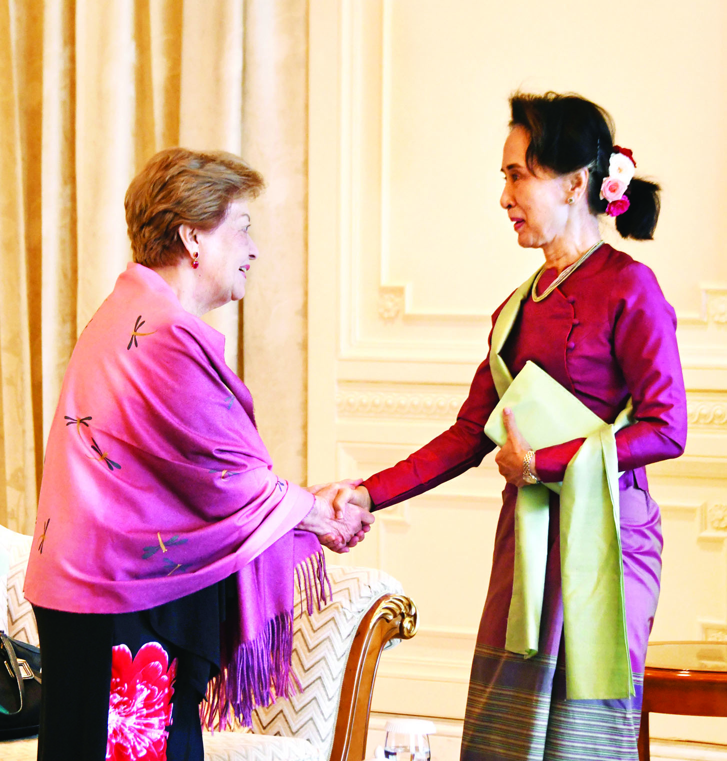 နိုင်ငံတော်၏အတိုင်ပင်ခံပုဂ္ဂိုလ် ဒေါ်အောင်ဆန်းစုကြည် အား သံအမတ်ကြီး မစ္စ ရိုဆာရီယိုမယ်နာလို ဦးဆောင်သော လွတ်လပ်သော စုံစမ်းစစ်ဆေးရေးကော်မရှင်အဖွဲ့ (ICOE)သည် ယနေ့နံနက် ၁၀ နာရီခွဲတွင် နေပြည်တော်ရှိ နိုင်ငံတော် သမ္မတအိမ်တော် ဧည့်ခန်းမ၌ လာရောက်တွေ့ဆုံသည်။