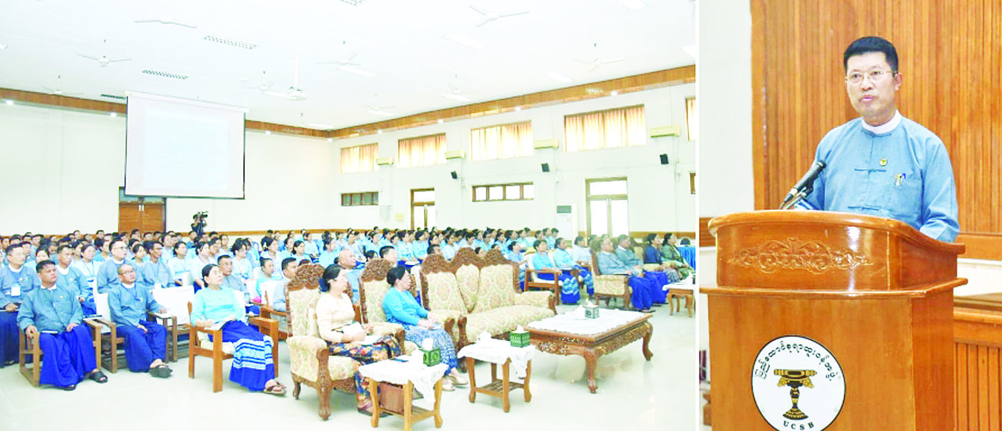 ဦးစွာ ပြည်ထောင်စုရာထူးဝန်အဖွဲ့ဥက္ကဋ္ဌ ဦးတင်မောင်ဝင်းက နိုင်ငံ့ဝန်ထမ်းများအနေဖြင့် နိုင်ငံတော်သမ္မတ၏ မိန့်ခွန်းတွင်ပါရှိသော လမ်းညွှန်မှာကြားချက်များကို အလေးအနက်ထား အကောင်အထည်ဖော် ဆောင်ရွက်ရမည်ဖြစ်ပါ ကြောင်း၊ ပြည်ထောင်စု ရာထူးဝန်အဖွဲ့သည် ဝန်ထမ်း ကောင်းမှ နိုင်ငံကောင်းမည်ဆို သည့် ဆောင်ပုဒ်နှင့်အညီ အရည် အချင်းပြည့်ဝသော နိုင်ငံ့ဝန်ထမ်းများ ဖြစ်လာစေရန် စနစ်တကျ ရွေးချယ်ပေးခြင်း၊ လေ့ကျင့်သင်တန်းပေးခြင်း၊ နိုင်ငံ့ဝန်ထမ်း ဥပဒေ၊ နိုင်ငံ့ဝန်ထမ်းနည်းဥပဒေများ၊ နိုင်ငံ့ဝန်ထမ်းကျင့်ဝတ်နှင့် စံတန်ဖိုးများကို စိမ့်ဝင်စေ၍ ခံယူချက် စိတ်ဓာတ်မြင့်မားစေရန် ဆောင်ရွက်ပေးခြင်းနှင့် ဝန်ထမ်းအဖွဲ့အစည်းအသီးသီးမှ ဝန်ထမ်း ရေးရာစီမံခန့်ခွဲမှု ကိစ္စများနှင့် ပတ်သက်၍ သဘောထားမှတ်ချက် ပြန်ကြားခြင်းတို့ကို တာဝန်ယူဆောင်ရွက်ရသော နိုင်ငံ့ဝန်ထမ်း အဖွဲ့အစည်းတစ်ခု ဖြစ်ပါကြောင်း၊ နိုင်ငံ့ဝန်ထမ်း အဖွဲ့အစည်းများသည် နိုင်ငံတည်ရှိသရွေ့ ထာဝရရှိနေရမည်ဖြစ်သည့်အတွက် ပြည်ထောင်စုရာထူးဝန်အဖွဲ့နှင့် မြန်မာနိုင်ငံ ဝန်ထမ်းအဖွဲ့အစည်းများရှိ နိုင်ငံ့ဝန်ထမ်းများသည် ကဏ္ဍအလိုက်၊ အဆင့်အလိုက် လုပ်ငန်းများစဉ်ဆက်မပြတ် မှန်မှန်ကန်ကန် လုပ်ဆောင်ပြီး နိုင်ငံ့အကျိုးကိုရှေးရှု၍ အမျိုးသား အကျိုးစီးပွားကို မြှင့်တင်ကြိုးစားဆောင်ရွက်လျက် ရှိပါကြောင်း။