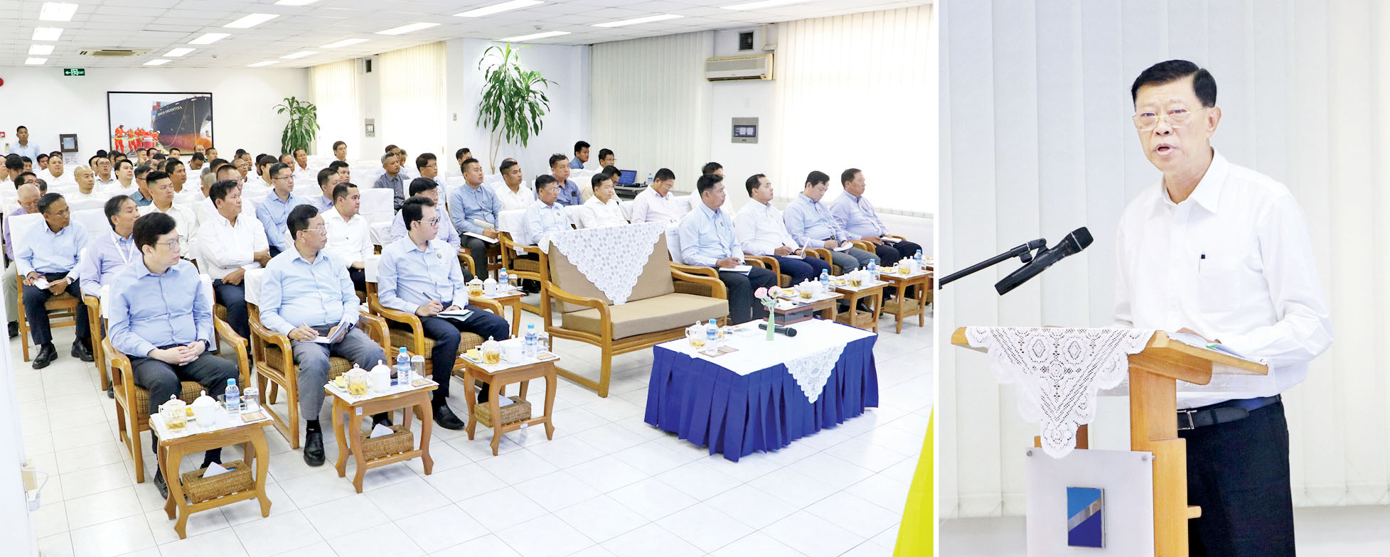 ယင်းနောက် ပြည်ထောင်စုဝန်ကြီးက မြန်မာနိုင်ငံ၏ နှစ်စဉ် ပင်လယ်ရေကြောင်းဖြင့် ကုန်သွယ် မှုတန်ဖိုးသည် နိုင်ငံတကာ ကုန်သွယ်မှုတန်ဖိုး၏ ပျမ်းမျှ ၇၀ ရာနှုန်းရှိသဖြင့် ပင်လယ်ရေကြောင်း ဖြင့် ကုန်သွယ်မှု၏ အဓိက ဝင်/ထွက်ပေါက်ဖြစ်သော ရန်ကုန်နှင့် သီလဝါဧရိယာရှိ ဆိပ်ကမ်းတံတားများအပါအဝင် ဆိပ်ကမ်းလုပ်ငန်း ကဏ္ဍတစ်ခုလုံး စဉ်ဆက်မပြတ် ဖွံ့ဖြိုးတိုးတက်ရေးအတွက် အစိုးရ-ပုဂ္ဂလိက ပူးပေါင်း ဆောင်ရွက်မှုကို အလေးထား ဆောင်ရွက်ကြရန် လိုကြောင်း၊ ရန်ကုန်ဆိပ်ကမ်း၏ ကုန်ကိုင်တွယ် ရရှိမှုပမာဏကို မြှင့်တင်နိုင်ရန် ပြည်တွင်း လိုအပ်ချက်ကို ဖြည့်ဆည်းပေးခြင်းအပြင် နိုင်ငံ၏ မဟာဗျူဟာမြောက် ပထဝီဝင် အနေအထားကို အကျိုးရှိစွာ အသုံးချပြီး အိမ်နီးချင်းနိုင်ငံများ၏ ပို့ကုန်/သွင်းကုန်များကိုပါ သယ်ယူ ပို့ဆောင်ပေးနိုင်မည့် ကုန်း-ရေ နှစ်သွယ် ဘက်စုံသယ်ယူပို့ဆောင် ရေးစနစ်ကို အကောင်အထည်ဖော် ရန်လိုကြောင်း၊ ထို့ကြောင့် ရန်ကုန် ဆိပ်ကမ်းမှတစ်ဆင့် ရေယာဉ် လွှဲပြောင်းတင်ဆောင်ခြင်း(Tran-shipment) ဝန်ဆောင်မှုနှင့် နိုင်ငံဖြတ်သန်း ကုန်သွယ်မှု (Transit Trade) ဝန်ဆောင်မှုများကို ပေးနိုင်ရန် အဆင်သင့်ဖြစ်မှု အတွက် ဆိပ်ကမ်းတံတားများကို ဆက်လက်တိုးချဲ့ တည်ဆောက်လုပ်ကိုင်ကြရန်လိုအပ်ပြီး နိုင်ငံ၏စွမ်းအင်လုံခြုံမှုအတွက်လည်း စက်သုံးဆီ တံတားများနှင့် သိုလှောင်ကန်များကို မြေနေရာ ချထားပေးပြီးဖြစ်သည့် ပုဂ္ဂလိက လုပ်ငန်းရှင်များက ဆက်လက် ရင်းနှီးမြှုပ်နှံ တည်ဆောက် လုပ်ကိုင်ကြရန်၊ ဆိပ်ကမ်းလုပ်ငန်း စွမ်းဆောင်မှုကို မြှင့်တင်နိုင်ရေးအတွက် ဒစ်ဂျစ်တယ်စနစ်ဖြင့် အသွင်ကူးပြောင်း ဆောင်ရွက်ကြရန်၊ စွမ်းအင်သုံးစွဲမှု လျှော့ချနိုင် ရေးအတွက် ဆိုလာစနစ်ကို အစားထိုး သုံးစွဲကြရန်နှင့် ဘက်ထရီစနစ်သုံး ကုန်ကိုင်တွယ် စက်ကိရိယာများနှင့် ယာဉ်များကို ပြောင်းလဲ အသုံးပြုကြရန် တိုက်တွန်းပြောကြားသည်။(ဝဲပုံ)