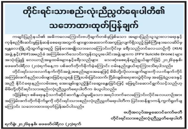 ၂၀၂၆ ခုနှစ်၊ မတ်လ (၂၇) ရက်နေ့တွင် ကျရောက်မည့် (၈၁) နှစ်မြောက် တပ်မတော်နေ့ အထိမ်းအမှတ် တိုင်းစစ်ဌာနချုပ်အဆင့် စစ်သည်တော်ကျင့်ဝတ်ပြိုင်ပွဲကို ယနေ့နံနက်ပိုင်းတွင် မြောက်ပိုင်းတိုင်းစစ်ဌာနချုပ်ရှိ ဗလမင်းထင်ခန်းမ၌ပြုလုပ်ရာ တိုင်းမှူး ဗိုလ်ချုပ် အောင်ဇော်ထွေးနှင့် တာဝန်ရှိသူများက စာမေးပွဲဖြေဆိုနေသည့် အရာရှိ၊ စစ်သည်များအား သွားရောက်ကြည့်ရှု အားပေးကြသည်။