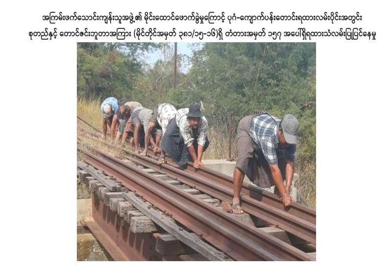 မကွေးတိုင်းဒေသကြီး၊ ညောင်ဦးမြို့နယ်၊ ပုဂံ-ကျောက်ပန်းတောင်းလမ်းပိုင်းအတွင်း စုတည်ဘူတာနှင့် တောင်ဇင်းဘူတာအကြား သံလမ်းပြေးယာဉ် RGC 103 ဖြင့် ရထားလမ်းပိုင်းအား ယနေ့နံနက် ၈ နာရီ ၅၀ မိနစ်ခန့်တွင် သွားရောက်စစ်ဆေးစဉ် မိုင်တိုင် ၃၈၁/၁၅-၁၆ ကြား ပေ ၂၀ အရှည်ရှိ သံဘောင်တံတားအမှတ် ၁၅၇ အနီးတွင် အကြမ်းဖက်သောင်းကျန်းသူအဖွဲ့က မိုင်းထောင်ဖောက်ခွဲဖျက်ဆီးခဲ့သဖြင့် ရထားသံလမ်းအရှေ့ဘက်ခြမ်း သံလမ်းဖိနပ် ၁ ပေခန့် ပဲ့ထွက်ပျက်စီးခြင်းနှင့် ဇလီဖား(၃)တုံး ကျိုးပဲ့နေကြောင်းတွေ့ရှိရသဖြင့် စုတည်-တောင်ဇင်း ရထားလမ်းပိုင်းအား နံနက် ၁၀ နာရီ ၁၆ မိနစ်ခန့်တွင် ယာယီပိတ်ထားခဲ့ကြောင်း သိရှိရသည်။