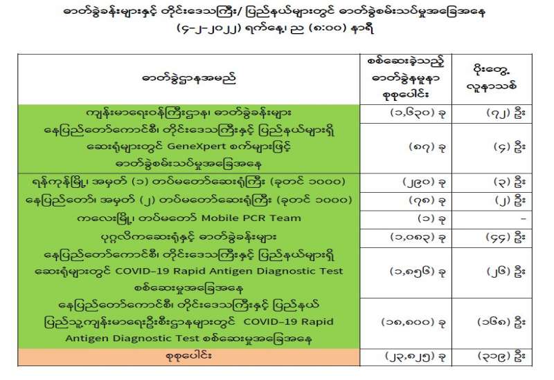 (၄-၂-၂၀၂၂) ရက်နေ့၊ ည (၈:၀၀) နာရီ ကျန်းမာရေးဝန်ကြီးဌာနအနေဖြင့် နိုင်ငံအတွင်း ကူးစက်ဖြစ်ပွားနေသော COVID-19 ရောဂါ ကာကွယ်၊ ကုသ၊ ထိန်းချုပ်ရေးလုပ်ငန်းများကို အရှိန်အဟုန်မြှင့် ဆောင်ရွက်လျက်ရှိပါသည်။