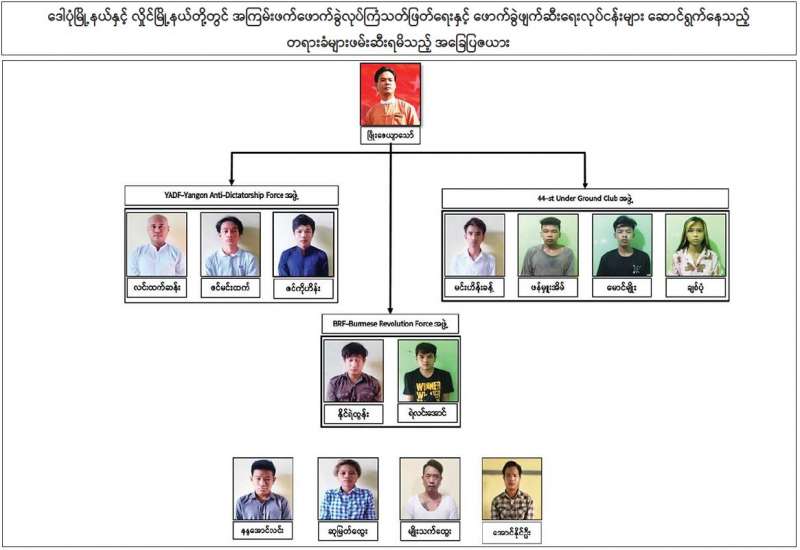 အကြမ်းဖက်အဖွဲ့အစည်းဖြစ်သော NUG ၏ စေခိုင်းချက်အရ အကြမ်းဖက် ဖောက်ခွဲဖျက်ဆီးခြင်းနှင့် အပြစ်မဲ့ပြည်သူများအား အဓိကပစ်မှတ်ထား၍ သတ်ဖြတ်ခြင်း တို့အား ဆောင်ရွက်နိုင်မှုမရှိစေရေး ဖော်ထုတ်ဖမ်းဆီးခြင်းများ ဆောင်ရွက်လျက်ရှိရာ အကြမ်းဖက်မှုအား မလိုလားသော ပြည်သူများ၏ သတင်းပေးမှုများကြောင့် ၂၀၂၁ ခုနှစ်၊ နိုဝင်ဘာလ ၁ ရက် နံနက် ၁၀ နာရီခန့်တွင် လုံခြုံရေးပူးပေါင်း အဖွဲ့သည် ဒေါပုံမြို့နယ်နှင့် လှိုင်မြို့နယ်များတွင် အကြမ်းဖက်လုပ်ကြံသတ်ဖြတ်ရေးနှင့် ဖောက်ခွဲ ဖျက်ဆီးရေး လုပ်ငန်းများ ဆောင်ရွက်ခဲ့သော တရားခံများ သင်္ဃန်းကျွန်း မြို့နယ်၊ နနွင်းကုန်း ရပ်ကွက်၊ ဣစ္ဆာသယလမ်း၊ သုမင်္ဂလာအိမ်ရာ၊ ၃ လွှာ၊ အခန်း (၃၀၁)၊ တိုက်အမှတ်(၁)၌ ရောက်ရှိနေကြောင်း သတင်းအရ ဝင်ရောက်ရှာဖွေခဲ့ရာ နိုင်ရဲထွန်း(၂၉)နှစ်၊ လင်းထက်ဆန်း (၃၁)နှစ်၊ နန္ဒအောင်လင်း(၂၃)နှစ်၊ ဇင်မင်းထက်(၁၈)နှစ်၊ မင်းဟိန်းခန့်(၁၉)နှစ်၊ ဆုမြတ်ထွေး (၂၃)နှစ်၊ ဇင်ကိုဟိန်း (၂၇)နှစ်၊ ရဲလင်းအောင်(၃၇)နှစ်၊ ဖန်မှူးအိမ် (၁၇)နှစ်တို့ ၉ ဦးအား ဖမ်းဆီးရမိခဲ့သည်။