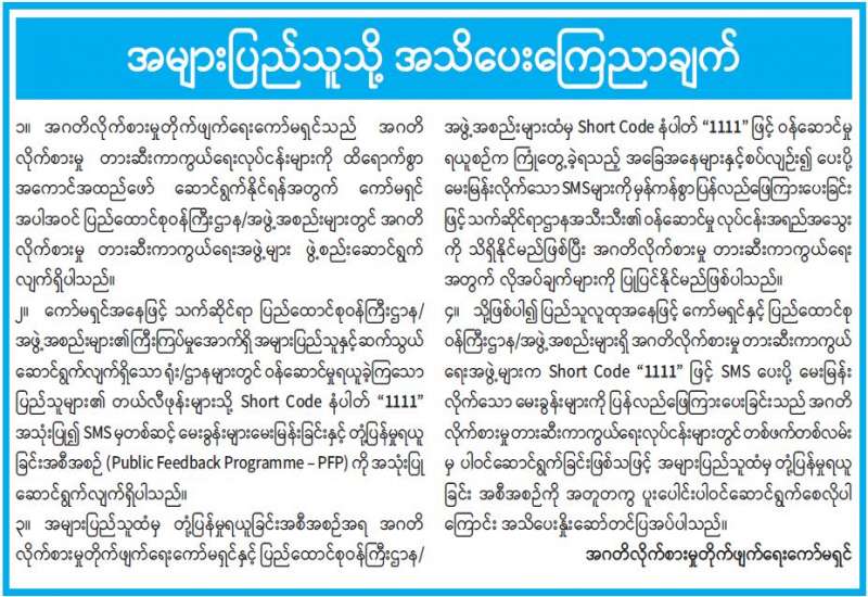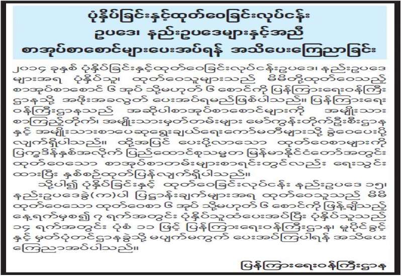 ပြန်ကြားရေးဝန်ကြီးဌာန ပုံနှိပ်ရေးနှင့် ထုတ်ဝေရေးဦးစီးဌာနက ပုံနှိပ်ထုတ်ဝေသော ၂၀၂၂ ခုနှစ် ရုံးသုံးပြက္ခဒိန်ကို ဖြန့်ချိရောင်းချနေပြီ ဖြစ်သည်။ ၂၀၂၂ ခုနှစ် ရုံးသုံးပြက္ခဒိန်ကို စက္ကူဖြူ၊ ချောဖြင့် တစ်စောင်လျှင် ငွေကျပ် ၅၀၀ နှုန်းဖြင့် စာပေဗိမာန်စာအုပ်ဆိုင် အမှတ် (တ-၅၅) သပြေကုန်းဈေး၊ နေပြည်တော် ဖုန်း- ၀၆၇-၃၄၁၄၆၈၁၊ စာပေဗိမာန်စာအုပ်ဆိုင် အမှတ် (၅၂၉/ ၅၃၁) ကုန်သည်လမ်း၊ ရန်ကုန်မြို့၊ ဖုန်း၀၁-၂၄၉၀၃၁၊ ၃၈၁၄၄၈၊ စာပေဗိမာန် စာအုပ်ဆိုင် အမှတ်-၁၅၉၊ ၈၆ လမ်း၊ ၂၁ လမ်းနှင့် ၂၂ လမ်းကြား၊ မန္တလေးမြို့ ဖုန်း၀၂-၄၀၃၀၁၈၆ နှင့် မြို့နယ်အသီးသီးရှိ စာပေဗိမာန် ကိုယ်စားလှယ်များထံ ဆက်သွယ်ဝယ်ယူရရှိနိုင်ပြီး ရုံးဌာန များနှင့်အသင်းအဖွဲ့များမှ လက်ကား ဝယ်ယူလိုပါက အမှတ် (၅၂၉/၅၃၁) ကုန်သည်လမ်း၊ ရန်ကုန်မြို့၊ ဖုန်း- ၀၁၂၄၉၀၃၁၊ ၃၈၁၄၄၈ တို့သို့ ဆက်သွယ် ဝယ်ယူနိုင်ကြောင်း သိရသည်။