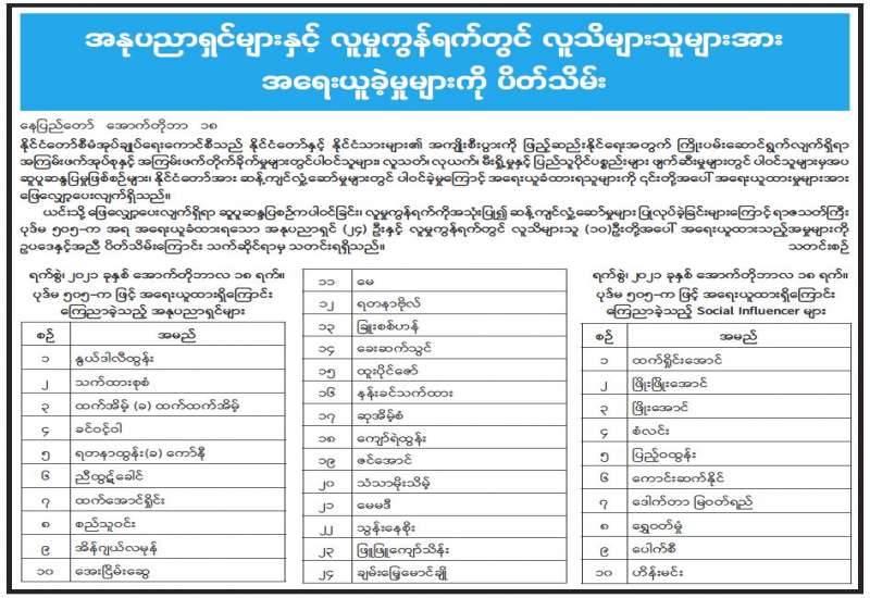 အနုပညာရှင်များနှင့် လူမှုကွန်ရက်တွက် လူသိများသူများအား အရေးယူခဲ့မှုများကို ပိတ်သိမ်း