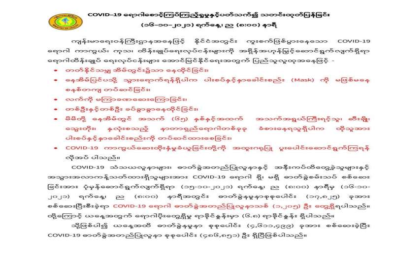 ကိုဗစ်-၁၉ ရောဂါအတည်ပြု လူနာများနှင့် သီးသန့်စောင့်ကြည့်ရမည့် သူများထားရှိရန်အတွက် တိုင်းစစ်ဌာနချုပ် နယ်မြေအသီးသီးရှိ တပ်မတော်ဆေးရုံများ၊ နယ်မြေခံသင်တန်းကျောင်းများ၊ စစ်ကြောရေးနှင့် တည်းခိုရေးစခန်းများ၌ စနစ်တကျလက်ခံ၍ ကျန်းမာရေးစောင့်ရှောက်မှုလုပ်ငန်းများ ဆောင်ရွက်ပေးလျက်ရှိသည်။ ထို့ပြင် ကျန်းမာရေးဝန်ကြီးဌာနနှင့် အခြားဌာနဆိုင်ရာ တာဝန်ရှိ သူများ၊ ပရဟိတအဖွဲ့အစည်းများ၊ တာဝန်သိပြည်သူများနှင့် ပူးပေါင်း၍လည်း သက်ဆိုင်ရာ မြို့နယ်များ၌ Quarantine Center များ ဖွင့်လှစ်ဆောင်ရွက် ပေးလျက်ရှိသည်။