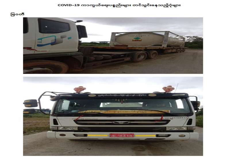 စီးပွားရေးနှင့် ကူးသန်းရောင်းဝယ်ရေးဝန်ကြီးဌာန အနေဖြင့် ကိုဗစ်-၁၉ ရောဂါကာကွယ်၊ ထိန်းချုပ်၊ ကုသရေးဆိုင်ရာပစ္စည်းများကို လေကြောင်း၊ ရေကြောင်းနှင့်နယ်စပ် ကုန်သွယ်ရေးစခန်း များမှနှောင့်နှေးကြန့်ကြာမှုမရှိ တင်သွင်းနိုင်ရေးအတွက် အချိန်နှင့် တစ်ပြေးညီ စီစဉ် ဆောင်ရွက်ပေးလျက်ရှိရာ ယနေ့တွင် ရန်ကုန်အပြည်ပြည်ဆိုင်ရာ ဆိပ်ကမ်းများ၊ ချင်းရွှ ေဟော်နှင့် မြဝတီကုန်သွယ် ရေးစခန်း (၂) ခုတို့မှ တင်သွင်းရာ၌ ကုမ္ပဏီ (၂) ခုမှယာဉ်စီးရေ (၃) စီးဖြင့် အောက်ဆီဂျင် အရည် (Bowser) ယာဉ် (၁) စီး တန်(၂၀) ၊ အောက်ဆီဂျင် (အိုးခွံ) (၄၈၀)၊ Oxygen Plant (၂) ခု၊ လုပ်ငန်းသုံး အောက်ဆီဂျင်စက် (Oxygen Generator (၂) ခုတို့ကိုတင်သွင်းခဲ့သည်။ အောက်ဆီဂျင် (အရည်) Bowser ယာဉ်(၁) စီးမှာ မြဝတီမှ ရန်ကုန်မြို့သို့ဖြစ်ပြီး Oxygen Plant (၂) ခုမှာချင်းရွှေဟော်မှ လွိုင်ကော်မြို့သို့ ဖြစ်ကြောင်း သိရှိရသည်။