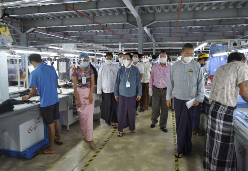 အလုပ်သမားဝန်ကြီးဌာန၊ ပြည်ထောင်စုဝန်ကြီး ဦးမြင့်ကြိုင်နှင့် ရန်ကုန်တိုင်းဒေသကြီး အစိုးရအဖွဲ့ ဝန်ကြီးချုပ် ဦးလှစိုးတို့သည် ယနေ့ နံနက်ပိုင်းတွင် ရန်ကုန်တိုင်းဒေသကြီး၊ လှိုင်သာယာ မြို့နယ်၊ ရွှေလင်ဗန်းစက်မှုဇုန်ရှိ Handa (Yangon) Garment Co., Ltd (အားကစားဝတ်စုံ ချုပ်လုပ်ငန်း) သို့ ရောက်ရှိပြီး ကိုဗစ်-၁၉ ရောဂါ ကာကွယ်ထိန်းချုပ်ရေးအတွက် ကျန်းမာရေး ဝန်ကြီးဌာနမှ ထုတ်ပြန်ထားသော စက်ရုံ၊ အလုပ်ရုံများဆိုင်ရာ လိုက်နာဆောင်ရွက်ရမည့် ညွှန်ကြားချက်များနှင့်အညီ ဆောင်ရွက်ထားရှိမှု၊ လုပ်ငန်းခွင်ဘေးအန္တရာယ် ကင်းရှင်းရေးနှင့် ကျန်းမာရေးဆိုင်ရာ လမ်းညွှန်ချက်များနှင့်အညီ ပြင်ဆင်ဆောင်ရွက်ထားရှိမှု အခြေအနေများကို လှည့်လည် ကြည့်ရှုစစ်ဆေးသည်။