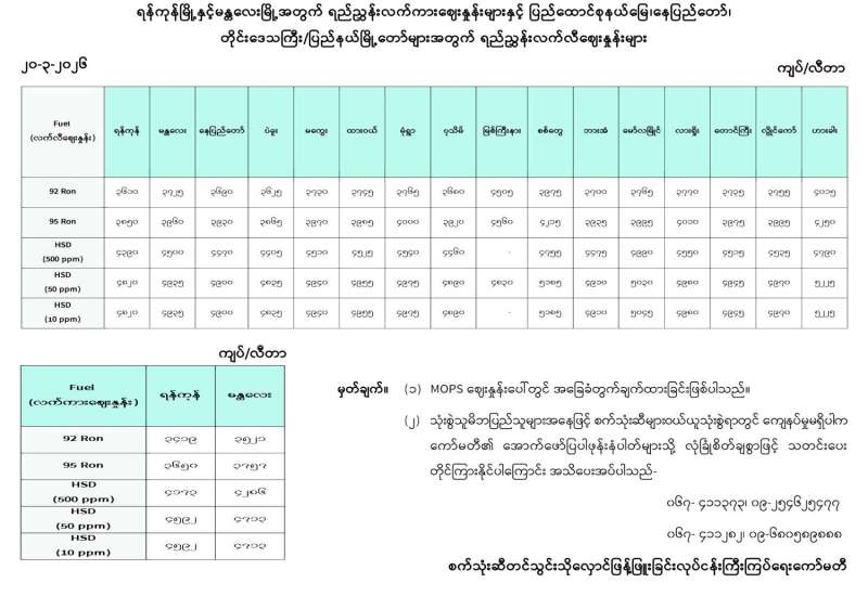 ရန်ကုန်မြို့နှင့် မန္တလေးမြို့အတွက် ရည်ညွှန်းလက်ကားဈေးနှုန်းများနှင့် ပြည်ထောင်စုနယ်မြေ နေပြည်တော်၊ တိုင်းဒေသကြီး/ပြည်နယ် မြို့တော်များအတွက် ရည်ညွှန်းလက်လီဈေးနှုန်းများ